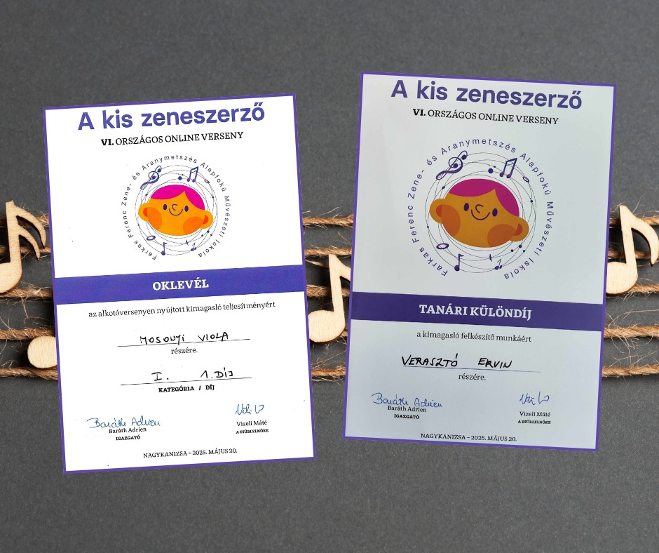 Iskolánkban mindig bátorítjuk a diákjainkat arra, hogy improvizáljanak, illetve saját kompozíciókat írjanak már zenei tanulmányaik kezdetekor is. Épp ezért különösen nagy öröm számunkra, hogy Mosonyi Viola I. díjat, tanára, Verasztó Ervin pedig Tanári Különdíjat nyert kimagasló felkészítő munkájáért a Farkas Ferenc Zene- és Aranymetszés AMI által meghirdetett ,,A kis zeneszerző” VI. Országos Online Versenyen. Gratulálunk!
